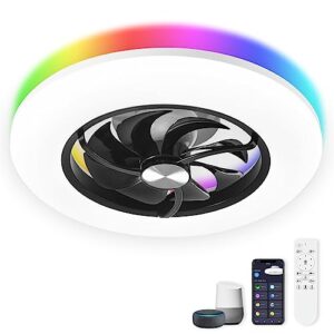 CHANFOK Neo Ceiling Fan with Light- 22 in Smart Low Profile Ceiling Fans with Alexa/Google Assistant/App Control 6 Speed Color Changing Ceiling Fan LED-RGB Back Ambient Ligh 【Dimmable & Light RGB Colors】:Our smart ceiling fan features a plump, slender design, and a brilliant blend of colorful light, making it both a statement piece and a subtle accent for your bedroom. With the Alexa or Smart Life app (iOS and Android), the RGB ceiling fan can dim or brighten the front white light. The intelligent LED fan light source supports adjustment from warm light (2700K) to daylight (6500K), and only 2.4GHz...